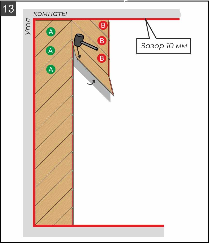 10.2. Продолжайте монтаж плашек «В», защёлкивая замки под углом до щелчка. Тщательно проверяйте стыки между плашками на отсутствие зазоров (особенно на внутренних углах) и контролируйте совпадение вершин плашек с соседними рядами после добавления каждой следующей плашки, при необходимости подбивайте их при помощи киянки и подбойника (рис. 13). Соблюдайте плотные и чёткие стыки всех плашек: даже мелкие расхождения при сборке создают накопительный эффект и приводят к смещениям плашек и другим ошибкам монтажа.
